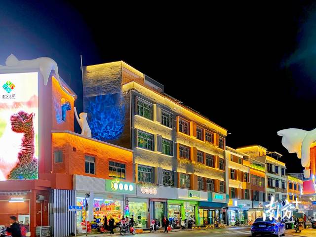 此后,当地选出老商业街增龙路段作为示范主街,针对沿街栋楼房进行品质提升,通过建筑微改造、户外广告牌美化、灯光亮化布设等,塑造出全新的圩镇主街面貌。在此基础上,永汉镇挖掘特色文化,从南昆山现有国家二级保护动物豹猫汲取形象灵感,打造名为“汉宝”的豹猫IP形象,并将其融入圩镇场景,在店铺房顶放置豹猫型雕塑,让圩镇别有一番趣味。